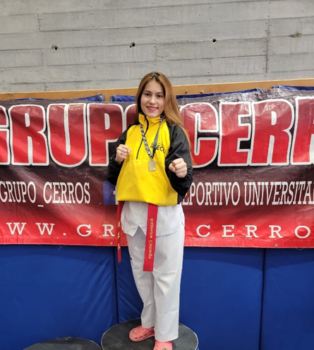 Deisy Diaz primer semestre de ingeniería biomédica, medalla de plata en la categoría de combate femenino principiante hasta 46 kilos.